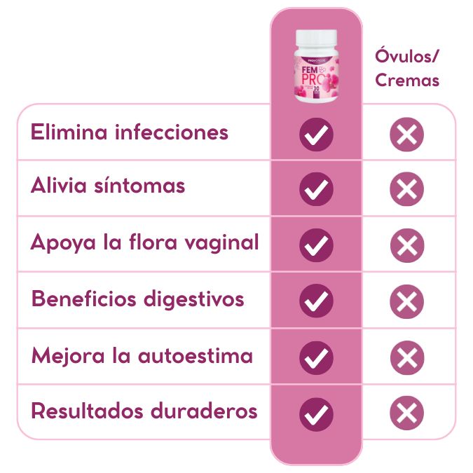 A diferencia de muchos medicamentos que solo alivian los síntomas por unos días y suelen tener efectos secundarios (como resequedad, ardor o alteración de la flora), FEMPRO trabaja desde la raíz del problema, restaurando el equilibrio natural de tu cuerpo.